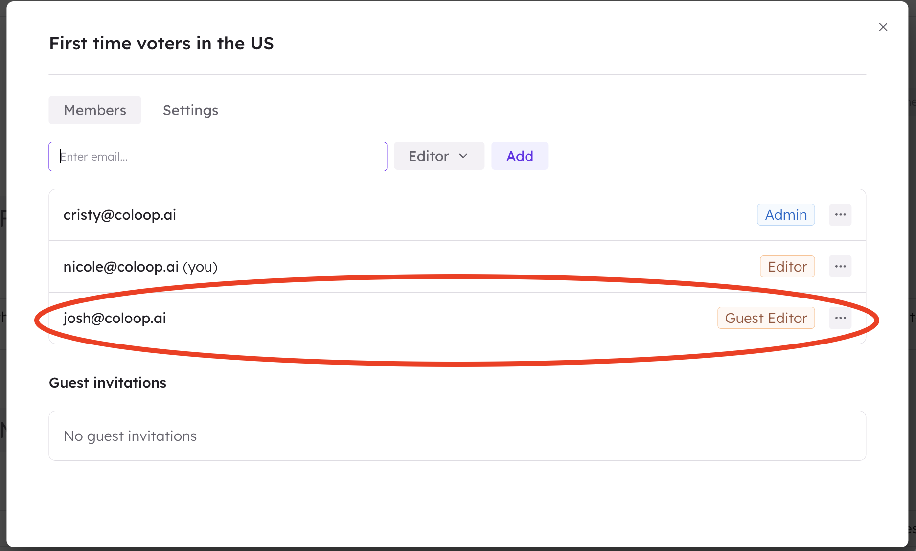 Project guests can only see the project they’ve been added to. They will not be able to see or access any other projects in your worksapce, only the projects they are members of. When invited to join a project, guests will recieve an email prompting them to create a CoLoop account. After logging in, guests can access the project by clicking on the guest project tab.