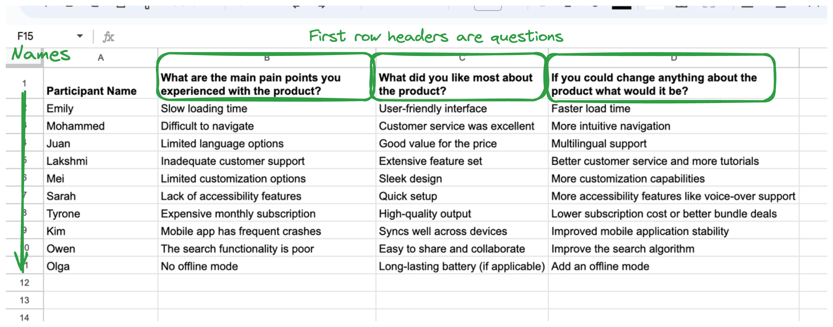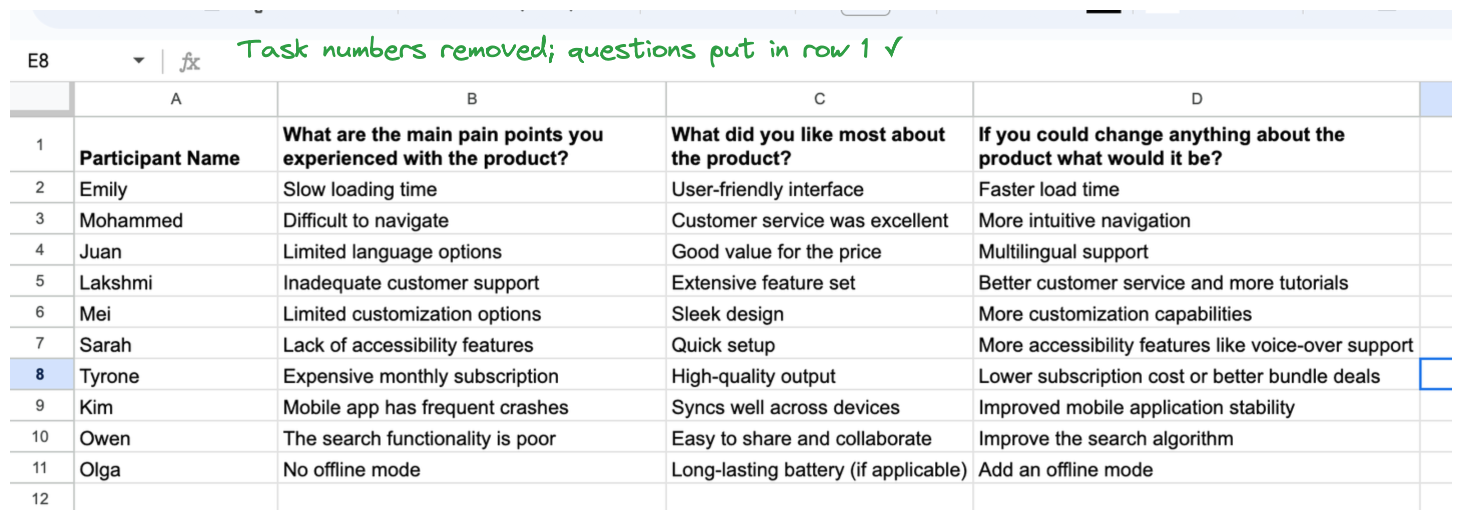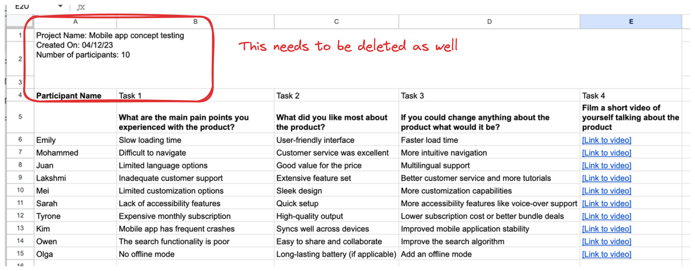 The first row in the spreadsheet must corredpond to the column titles and be followed immediately by participant responses. Any other rows or columns e.g. Task numbers need to be deleted. The task description / stimulus or question will be used for context so these need to be merged into the column header.Task numbers in the top row