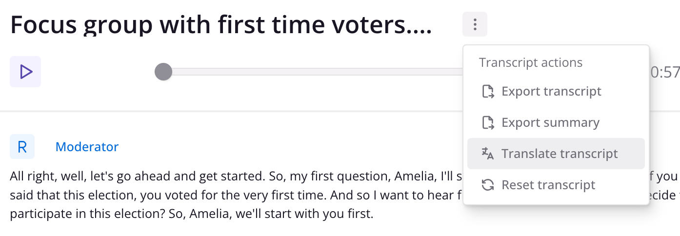 CoLoop offers translation options (powered by DeepL) for these 30 Non-English languages in order to facilitate analysis!- In order to translate your transcript into English, click on the three dots next to the file name when the transcript is open and then ‘Translate transcript’: