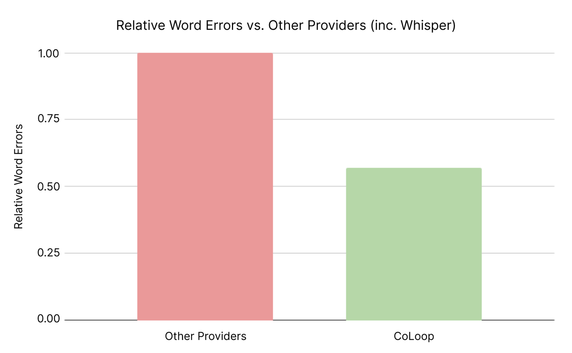 CoLoop comes with the best commercially available machine transcription service built in. Transcription word errors are 43% lower on real world noisy datasets than common providers such as Otter, Teams and OpenAIโs whisper (see below).