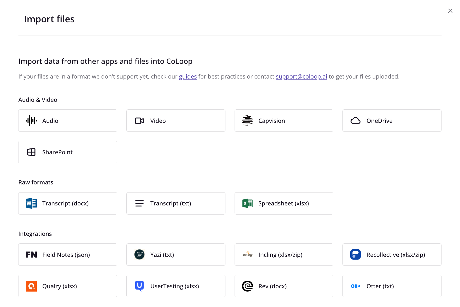 CoLoop also supports a range of different text formats. The following table outlines the list of support file types:Supported Text