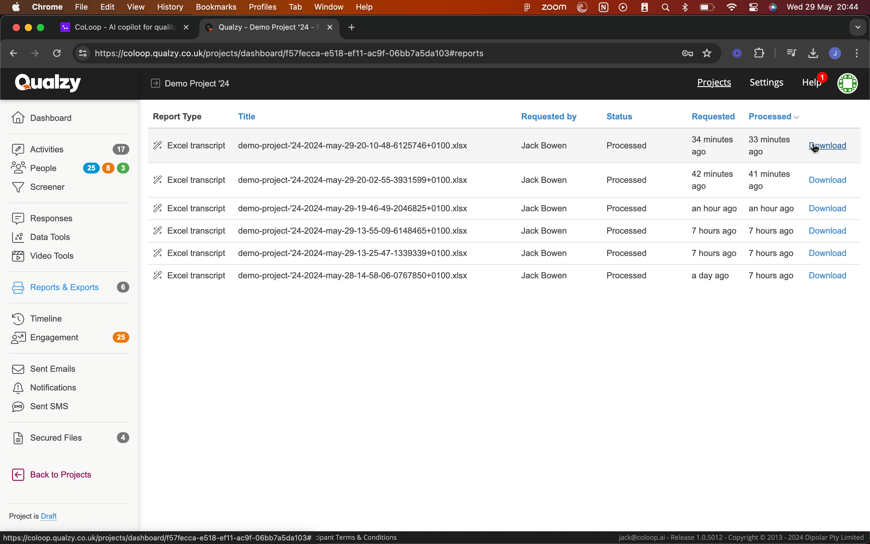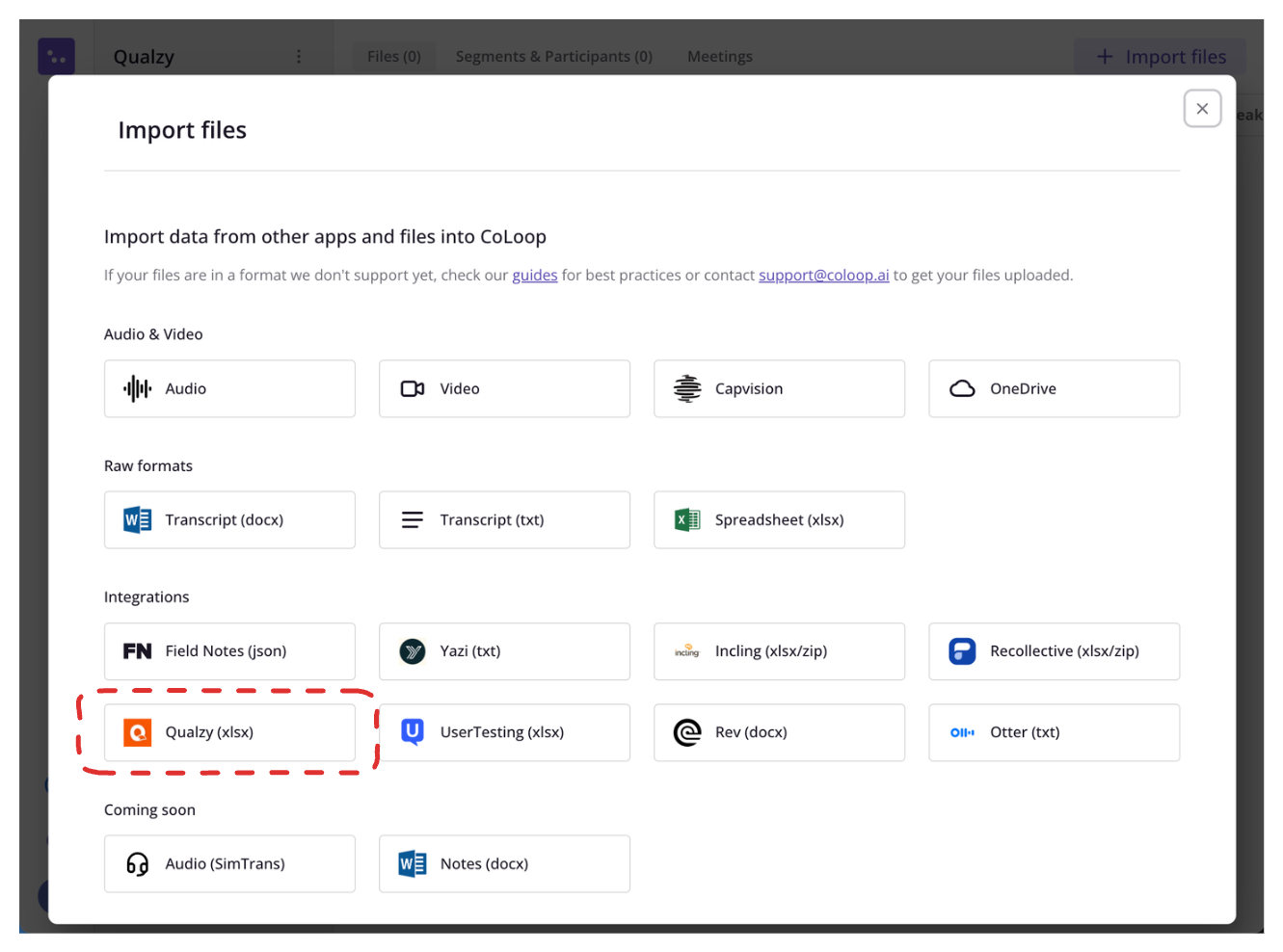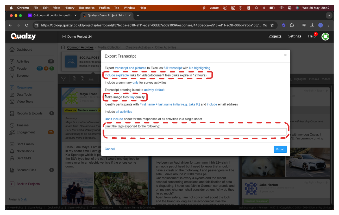 Users can also export data from the Qualzy responses window. Click on the export button on the top left of the screen and select the “CoLoop.ai Data File” export button..png?fit=max&auto=format&n=Xf3NsY3o4cg2QZJp&q=85&s=f366cd34465e27d2bd781e50b24af7b4)